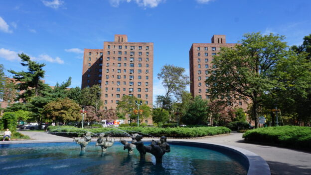 The point where Unionport Road intersects with Metropolitan Avenue is articulated by a large roundabout park named Metropolitan Oval. Since those are the main thoroughfares of the Complex, and were designed to have heavier traffic, the Oval also acts as a speed regulator for vehicles. The two-acre park features a large decorative wading pool with a fountain named “Fantasia”, created in 1939 by renowned sculptor Raymond G. Barger for the New York World’s Fair, and installed at The Oval in 1941. Seating areas and landscaped flower beds surround the pool, and on the southwest section there is a memorial for servicemen who died in World War II, the Korean War and the Vietnam War. It was recently renamed the Aileen B. Ryan Oval after a former resident and prominent New York State Assemblymember and Bronx Council Member-at-Large.