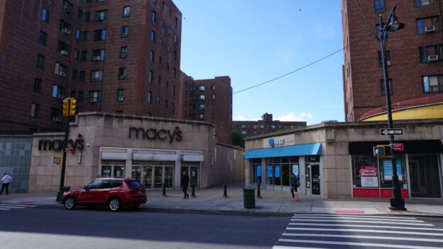 As the main thoroughfares of the Complex, Unionport Road and Metropolitan Avenue were conceived as mixed-use corridors. The largest shopping center is located at the southwest corner of Metropolitan Avenue, and includes a Macy’s Department Store, the first branch after its 34th Street flagship store in Manhattan, a USPS office, and the former Loew’s American Theater, designed by prominent architect John Eberson in 1940. The rest of this commercial area was planned to have roughly 200 stores i Moderne-style buildings with glazed terra cotta panels, curving facades, and stylized signage. Until 1985, this was also the location of the Parkchester branch of the New York Public Library. Through a partnership established in 1942, the Metropolitan Life Insurance Company gave the library, rent-free, a fully furnished 4,600 square-foot space at 1384 Metropolitan Avenue, becoming the first sub-branch in the city to be located in a housing development. By 1950, circulation outranked many of the city’s full branches, and several requests were made to extend the initial 32-hour weekly operation.